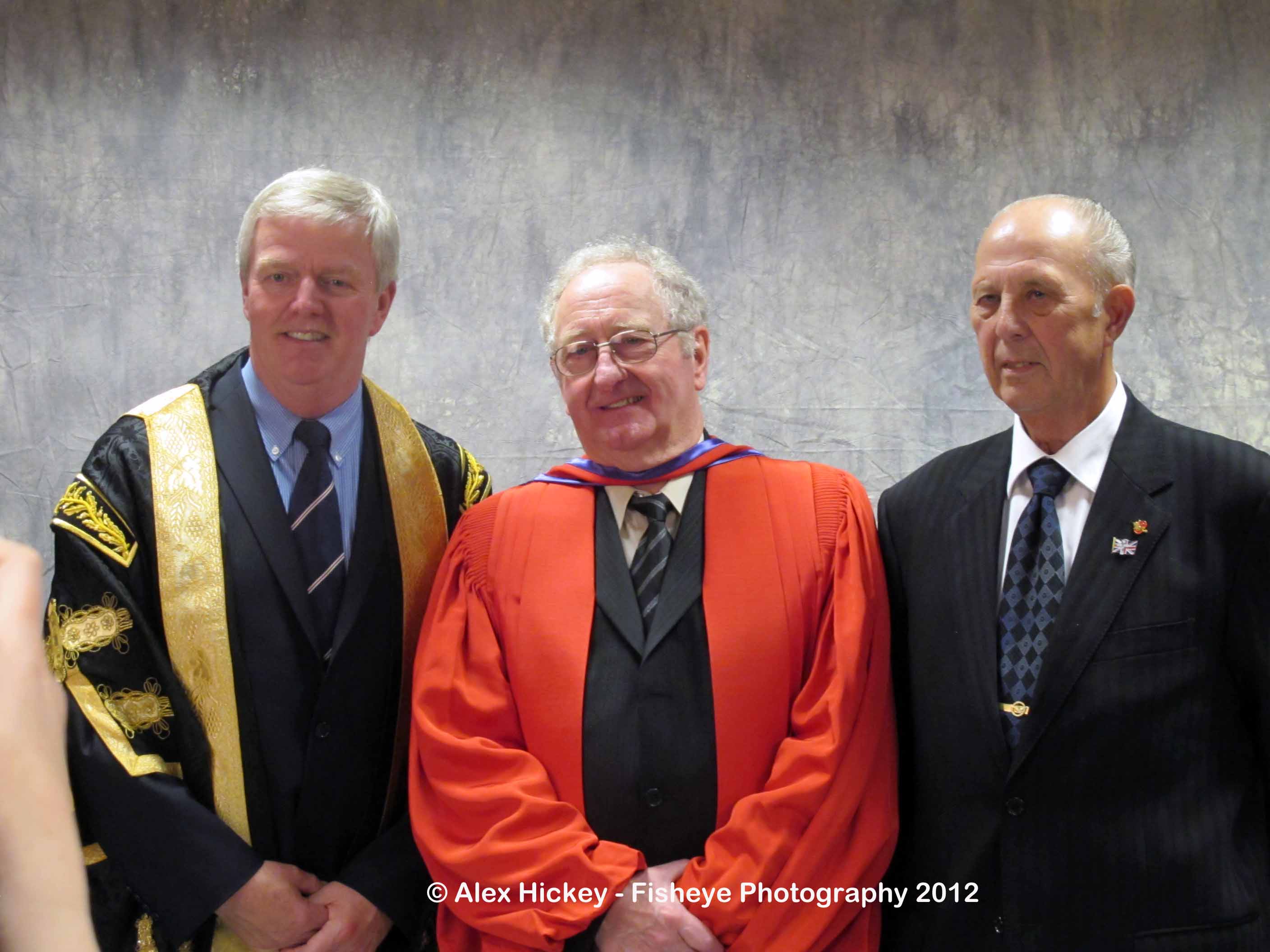 You can read the lyrics to this song here accompanied by explanation of some of the background to events mentioned in the it. When Bud Davidge was awarded an Honorary Degree by Memorial University for his contribution to Newfoundland and Labrador’s musical heritage in May 2012, he acknowledged in his acceptance speech the significant contribution that James Johnson made to his writing of the song. In the audience, unknown to Davidge was his supporter and motivator, James Johnson who had traveled to Corner Brook for the occasion. It was at that event that Jim had the opportunity to meet another hero of his – General Rick Hillier. The three of them are in the photograph below.