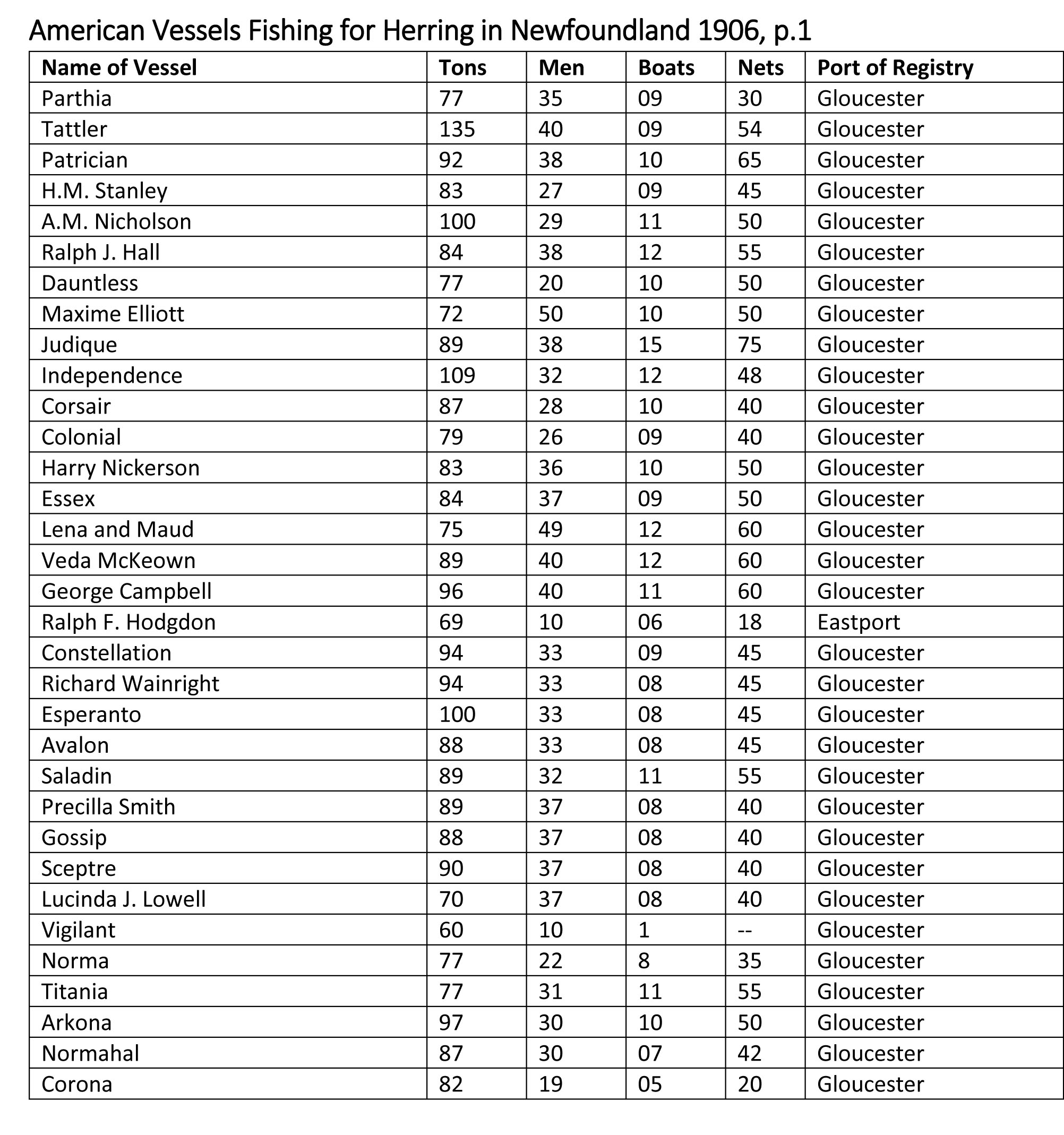 In his report, he went on to provide a list of the United States fishing vessels that had arrived in the Bay of Islands seeking herring. Most, if not all, would have been in Fortune Bay in previous years.   As you read through the list you will note that the names of several vessels are repeated.  I do not know if this was an error or if there were more than one vessel with the same name. You will also note that the vast majority of vessels hailed from the port of Gloucester.