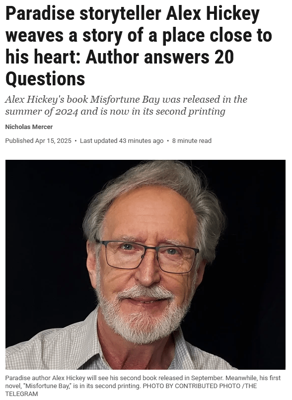 The Telegram’s Nicholas Mercer conducted a Twenty-Question interview with me for the April 15th edition. It was a delightful activity and a most enjoyable interview with Nick. I’ve done interviews with him before, and every time it has been as professional as it gets. He brings to the conversation insight and genuine interest. Below is an image, a screenshot, of the lead to the story. At the bottom of the image is a direct link to the story.
