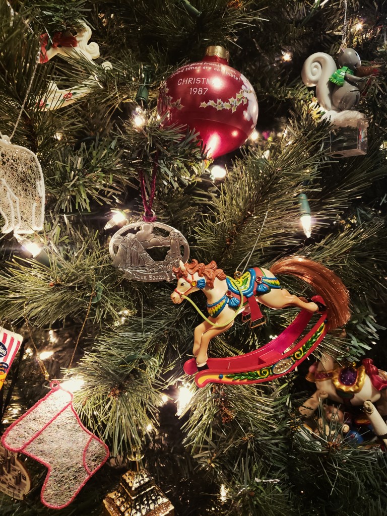 Resting on its sweetly scented needles or hanging below their canopy are miniature, framed photographs of special people, lovingly painted odd coloured walnut husks, crocheted stars and balls starched to perfection, and bells from the collars of family pets. In between them hang twirling ballerinas, team emblazoned hockey sticks, hand-written scrolls, fifteen-year-old letters to Santa, colourful plastic childhood cartoon characters and special, never-to-be-forgotten cards. And, if you like, toss a few strands of tinsel here and there in remembrance of aunts and grandmothers whose love of that shiny, stringy material still haunts your memory.